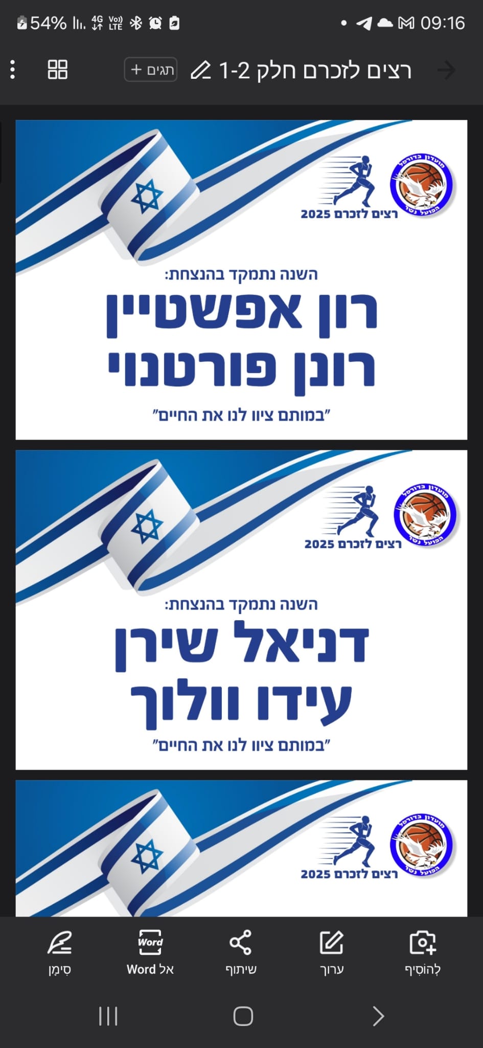 ב30 לאפריל 2025, ילדי מחלקת הכדורסל של הפועל נשר, העלו את זכרם של חללי מלחמת חרבות ברזל בריצה עם שמות החללים על גופייתם. היתה זו מחווה מרגשת ומעציבה כאחד, בו הזדהנו כולנו, עם גיבורי המלחמה.